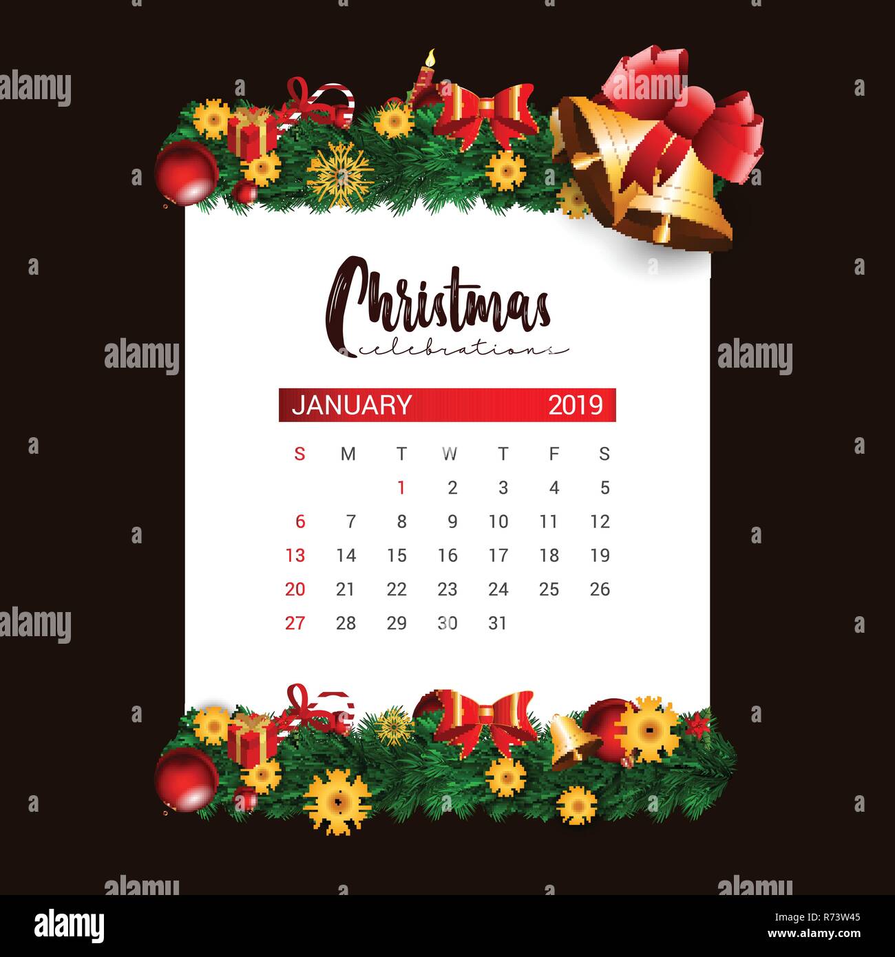 2019 Januar Kalender Design Vorlage Von Weihnachten Oder Neujahr Dekoration Stock Vektorgrafik Alamy