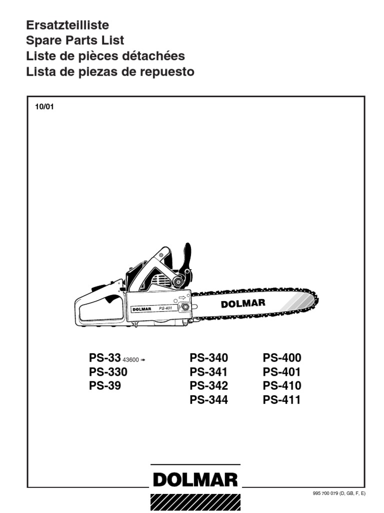 Dolmar Parts Manual For Chainsaw Models Ps 33 Ps 340 Ps 400 Ps 330 Ps 341 Ps 401 Ps 39 Ps 342 Ps 410 Ps 344 Ps 411